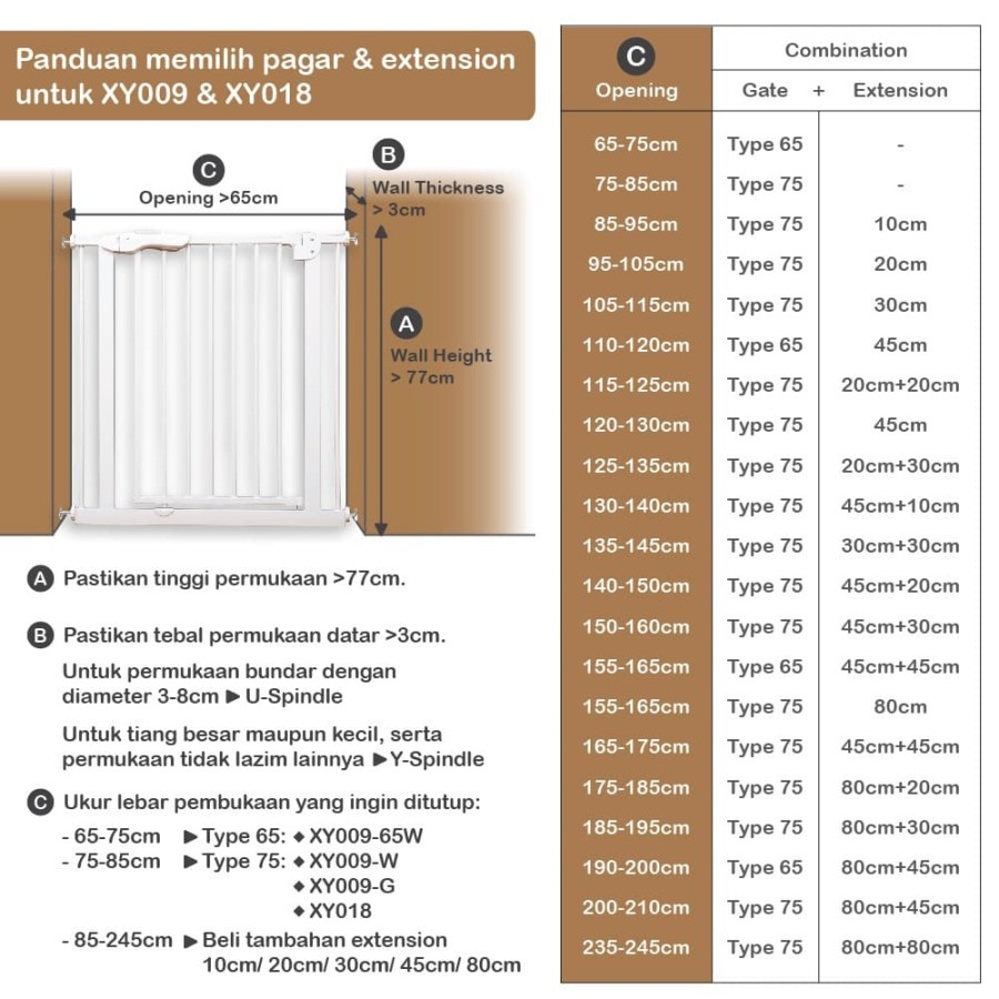 Pagar pengaman bayi tipe XY-018 dari Baby Safe ini berguna untuk menjaga Anak dari melewati batas aman yang yang sudah ditentukan oleh Ayah / Ibu. Dilengkapi dengan mekanisme tutup pintu otomatis (auto-close) dan kunci ganda (double-lock) untuk memastikan keamanan sang Anak. Selain untuk menjaga keamanan Anak, pagar ini juga bisa dipakai untuk membatasi hewan peliharaan dari area tertentu dalam rumah.
