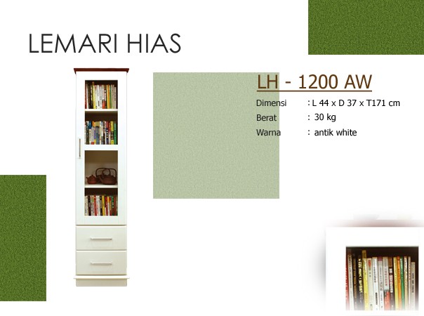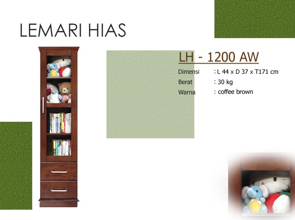 Produk terbaru lemari hias LH-200. Dapat berfungsi untuk meletakan barang dekorasi, aksesoris kesayangan, buku, ataupun pajangan favorit Anda. Produk lemari ini 90 % dari kayu solid. Bahan baku yang digunakan adalah tanaman kayu yang dapat ditanama ulang sehingga merawat keseimbangan ekosistem hutan, salah satu jenis adalah kayu pohon getah.
