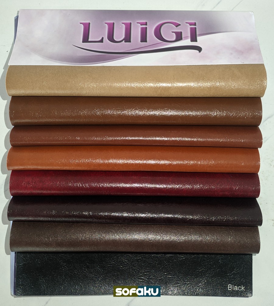 Oscar / Kulit Sintetis Kulit Jeruk Tekstur Halus Merk Luigi. Dengan tampilan wet look untuk kesan klasik pada kursi. Cocok diaplikasikan untuk tipe sofa armchair, kursi jati dengan jok sandaran bahan kulit ataupun kulit kursi kantor.