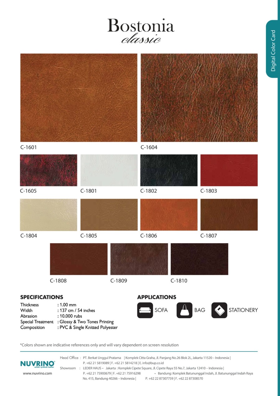 Bahan premium Nuvrino, series Bostonia Classic dengan texture khusus dengan berbagai pilihan warna dengan kualitas terbaik untuk bahan sofa, pembuatan kerajinan tas, dompet, fashion, ataupun jok kursi kantor.