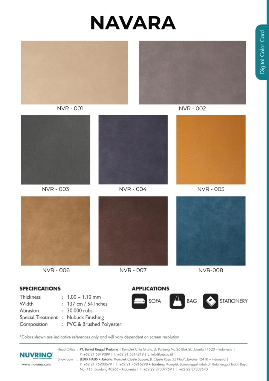 Bahan premium Nuvrino, series Bostonia Classic dengan texture khusus dengan berbagai pilihan warna dengan kualitas terbaik untuk bahan sofa, pembuatan kerajinan tas, dompet, fashion, ataupun jok kursi kantor.